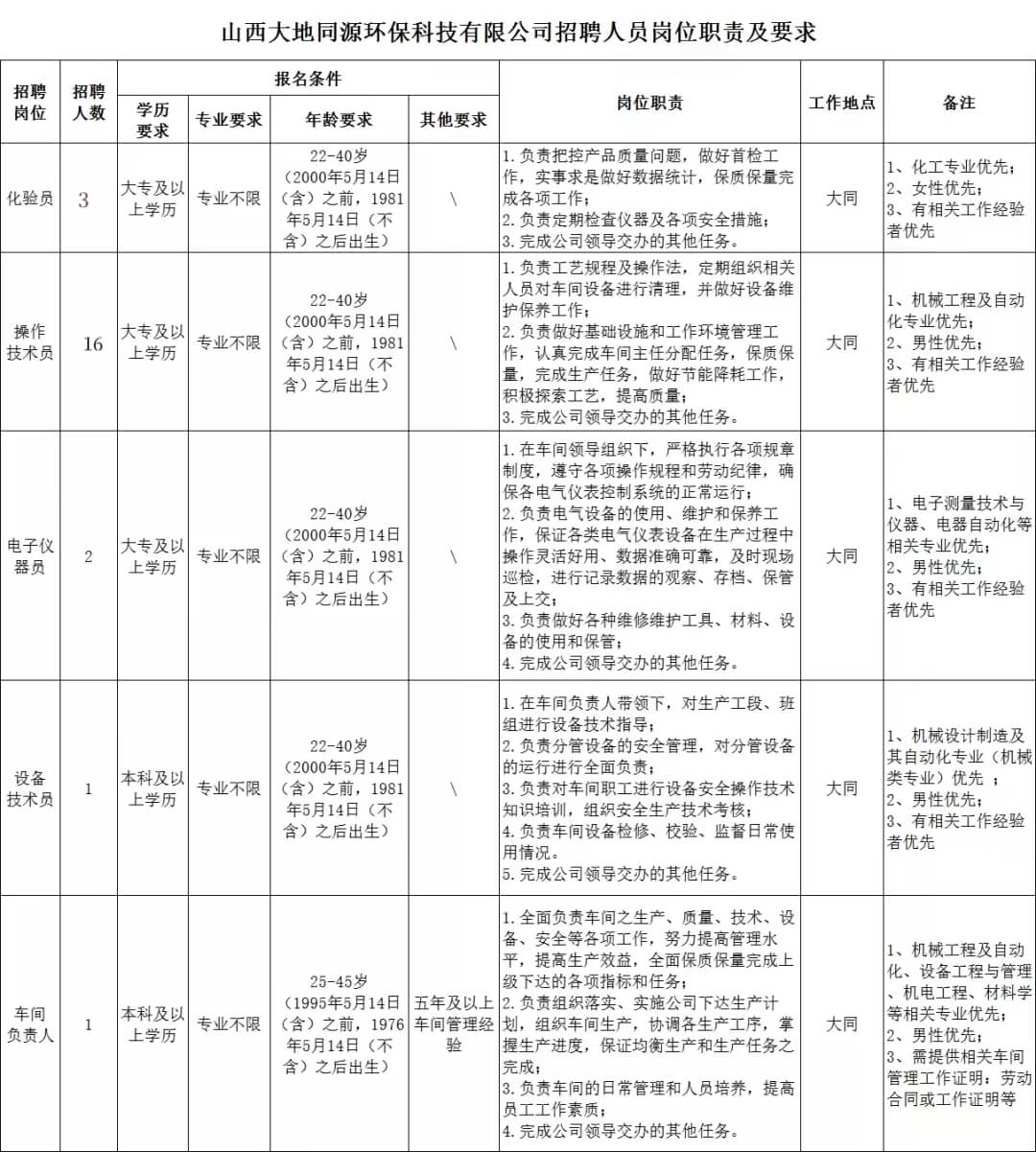 为适应山西大地同源环保科技有限公司(以下简称:“大地同源”)全方位高质量发展的需要,根据实际工作需求,现面向社会公开招聘工作人员23名(其中化验员3名,操作技术员16名,电子仪器员2名,设备技术员1名,车间负责人1名),现就有关事项公告如下: