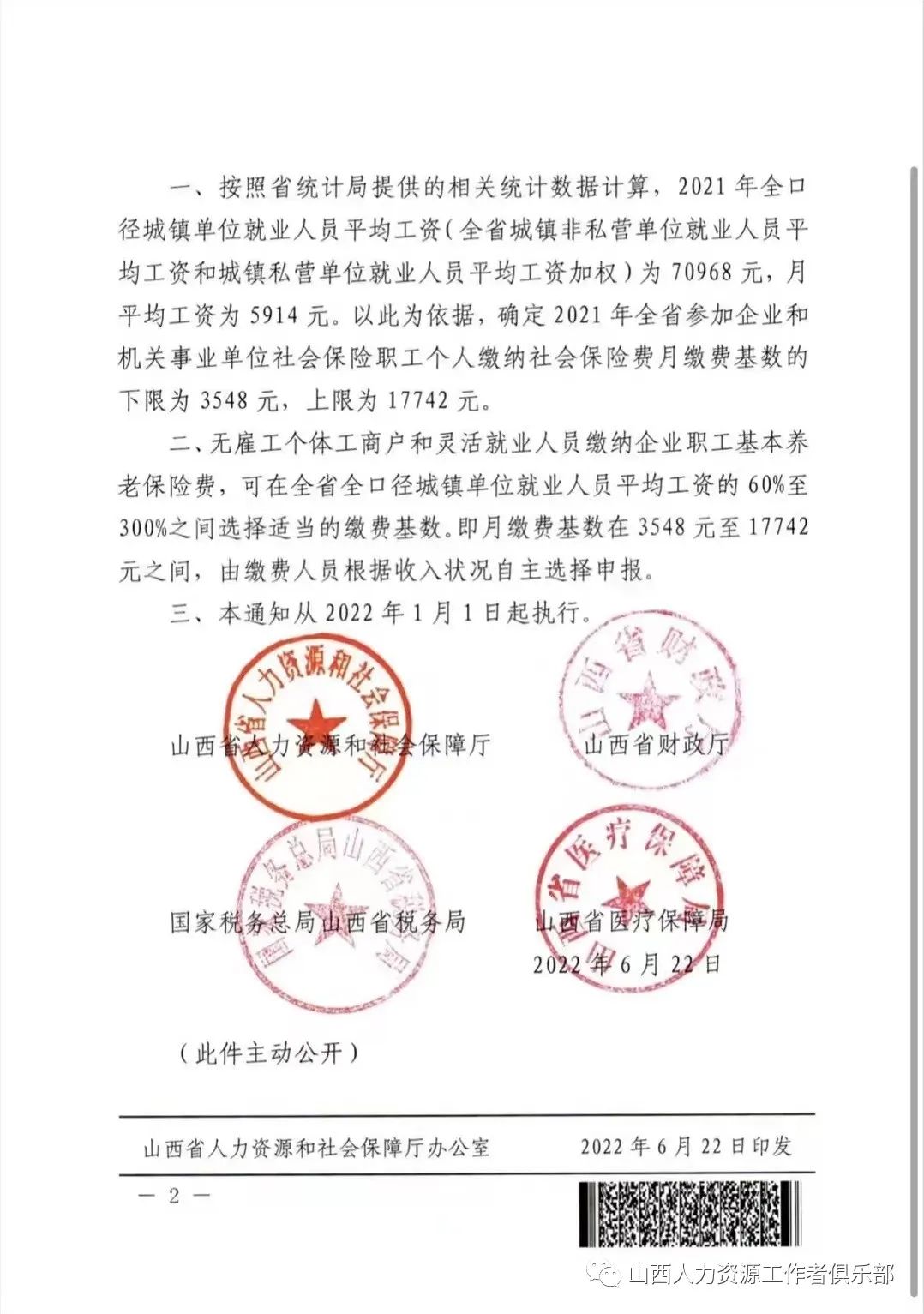 2022年社会保险缴费基数上限17742元,下限3548元