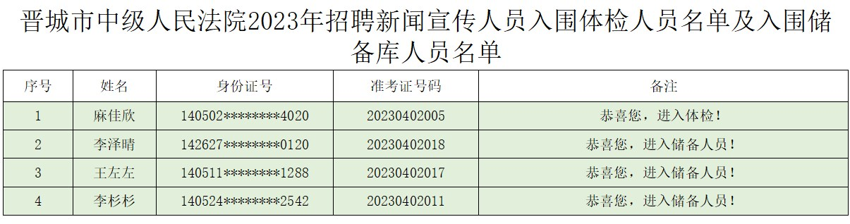 根据晋城市中级人民法院2023年新闻宣传人员招聘公告的相关要求,经过网上报名、资格审查、笔试、实践操作、资格复审、综合面试等环节,现就体检有关事项通知如下: