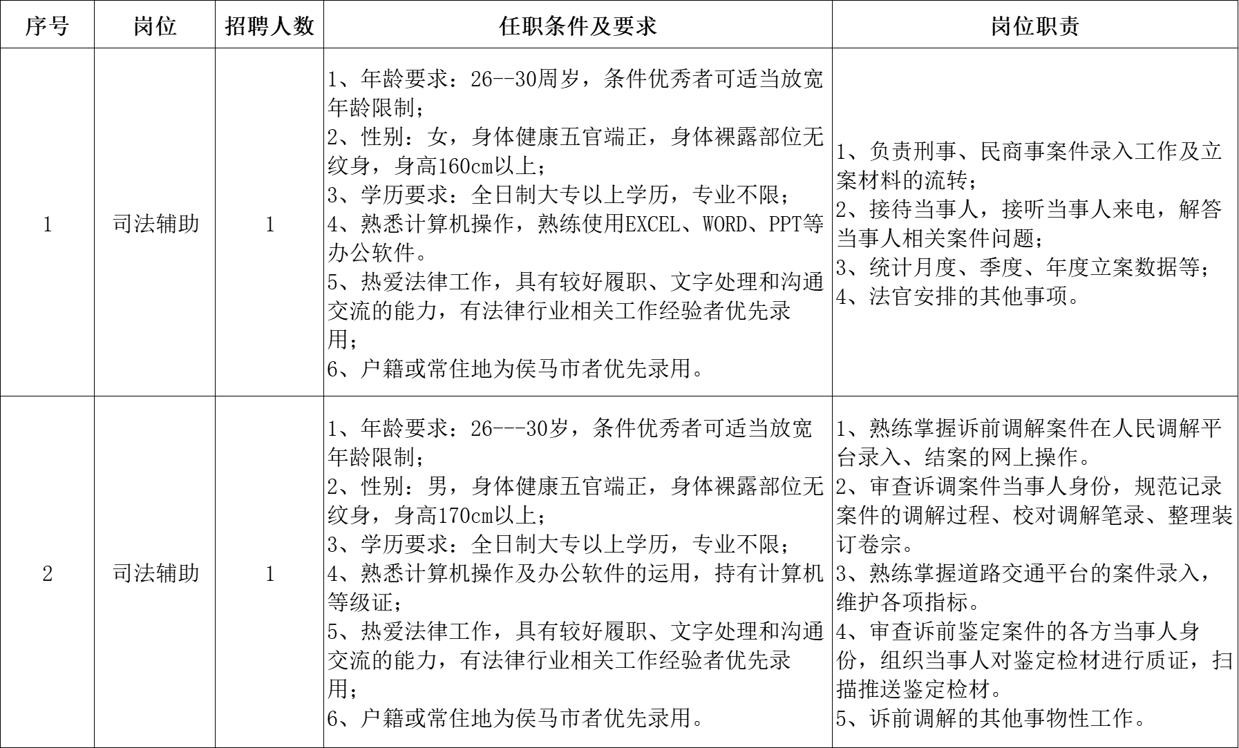 根据工作需要,临汾市侯马市人民法院委托山西威廉希尓指数500人力资源派遣有限公司(以下简称:威廉希尓指数500人力资源公司),面向社会公开招聘2名司法辅助人员,现将有关事项公告如下:
