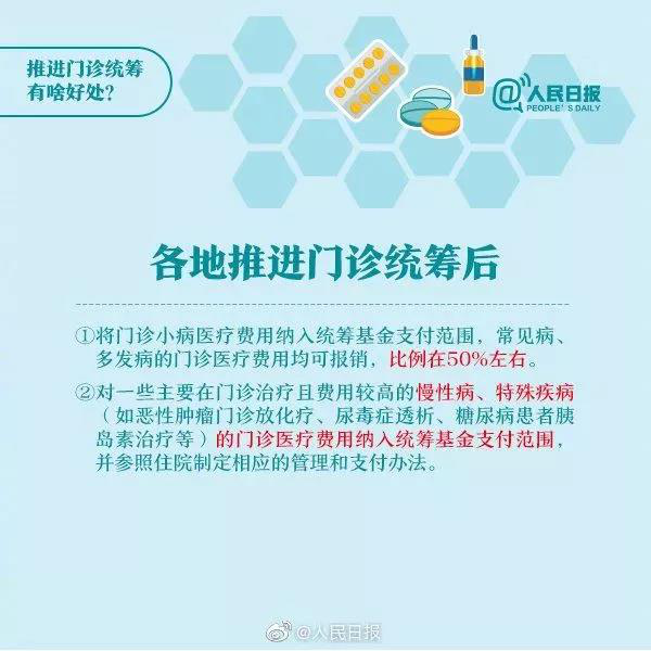 《通知》着重提出要提高政策范围内住院费用报销比例,建立健全城乡居民医保门诊费用统筹及支付机制,重点保障群众负担较重的多发病、慢性病。并且将高血压、糖尿病等门诊用药纳入医保报销,具体方案另行制定。