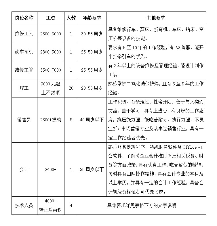 技术人员共包含四种岗位,各岗位具体要求如下: