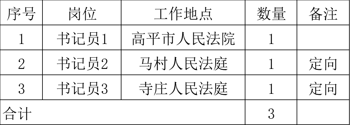 说明:书记员2、书记员3岗位定向任职马村、寺庄人民法庭工作,合同期内不能定向任职的解除劳动合同;居住地在马村镇、寺庄镇的优先录用。