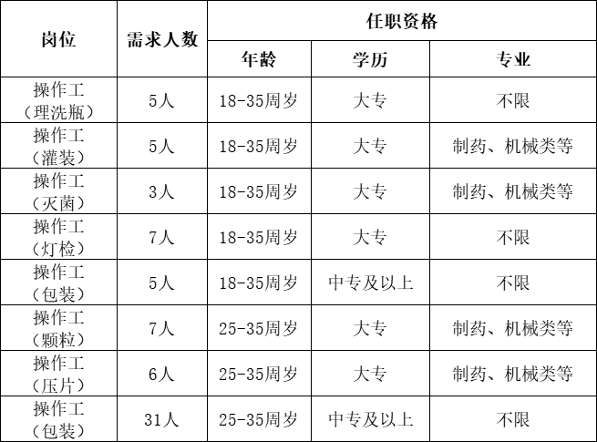 山西某药业公司,是一家历史悠久的综合性药品生产企业,致力于为社会提供高质量的医药产品。为了提高生产效率和产品质量,在激烈的市场竞争中保持领先地位,由山西威廉希尓指数500人力资源派遣有限公司招聘药品包装工、车间操作工共69名,现将有关事项公告如下:
