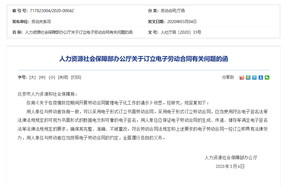 近日,人力资源社会保障部办公厅印发《人力资源社会保障部办公厅关于订立电子劳动合同有关问题的函》(人社厅函〔2020〕33号)。