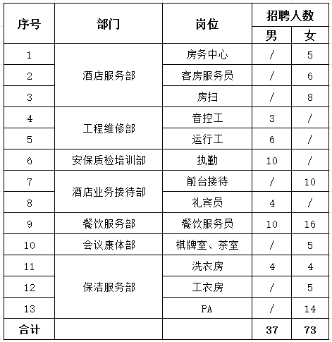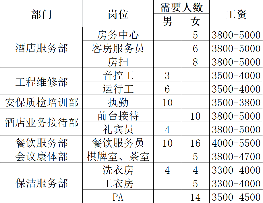根据工作需要,威廉希尓指数500人力资源集团公开招聘110名工作人员,并外派至汾酒国际大酒店工作,现将有关事项公告如下: