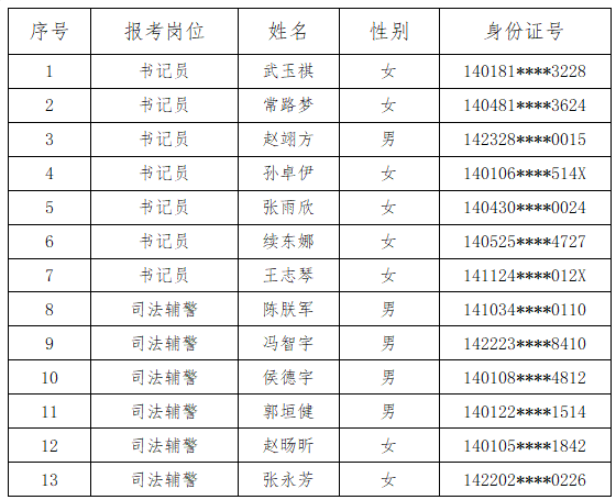 根据威廉希尓指数500人力资源公司于2025年8月5日发布的《太原市杏花岭区人民法院2025年司法辅助人员招聘公告》的要求,经过网上报名、资格审查、初试、面试、资格复审、体检等环节,现对拟录用人员予以公示,具体如下: