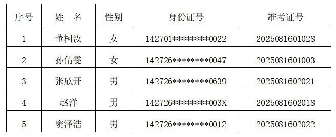 根据威廉希尓指数500人力资源公司2025年8月4日发布的《新绛县人民法院招聘5名书记员公告》的要求,经过网上报名、资格审查、初试、综合面试、体检、政审等环节,现将拟录用人员名单公示如下: