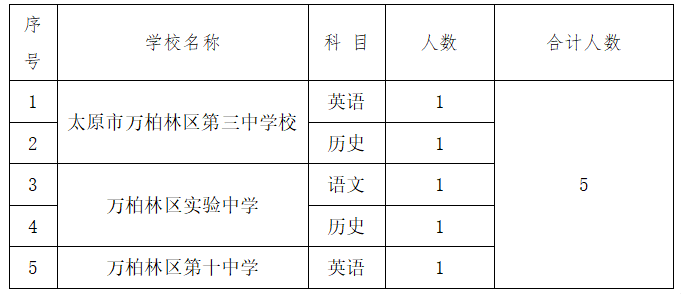 因太原市万柏林区第三中学校、万柏林区实验中学、万柏林区第十中学教师未招满,为满足我区部分中学校教学需要,结合学校实际,现面向社会为以上学校补充招聘政府购买服务教师,具体公告如下: