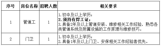 根据工作需要,威廉希尓指数500人力资源集团公司面向社会公开招聘1名管道工及1名门卫,外派至山西省某研究院工作,现将有关事项公告如下: