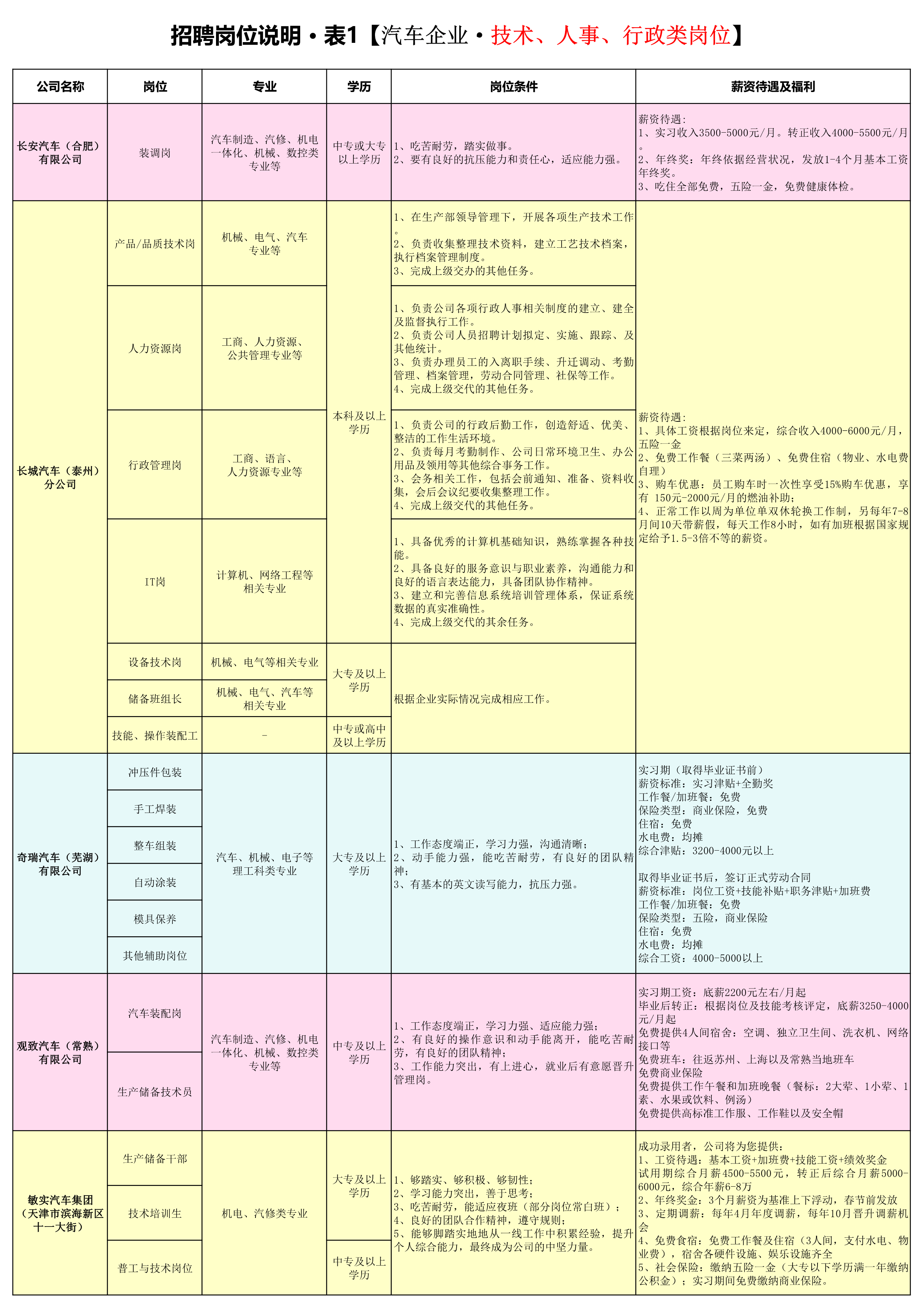 汽车企业——技术、人事、行政类岗位,详见附件之《招聘岗位说明 表1》