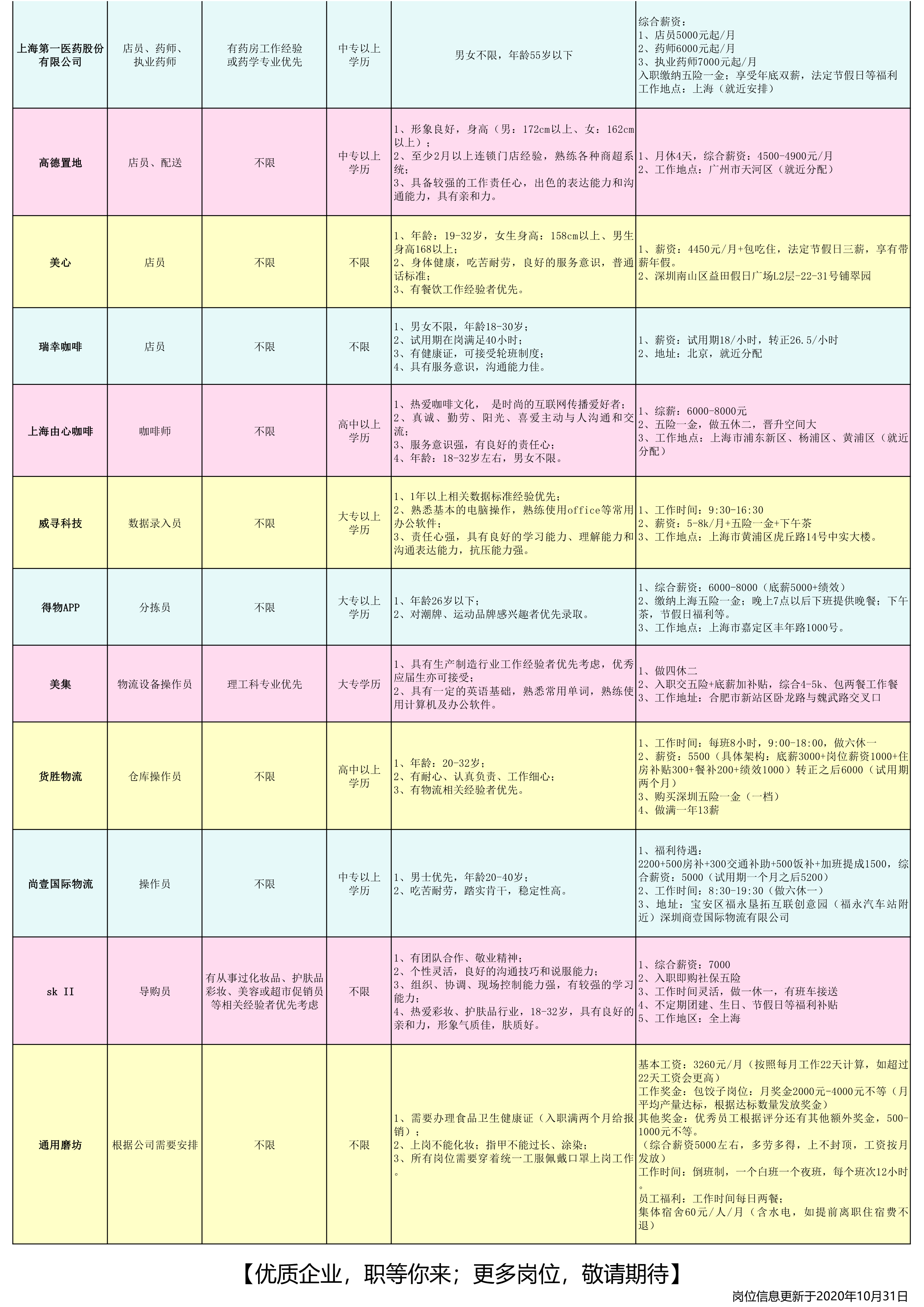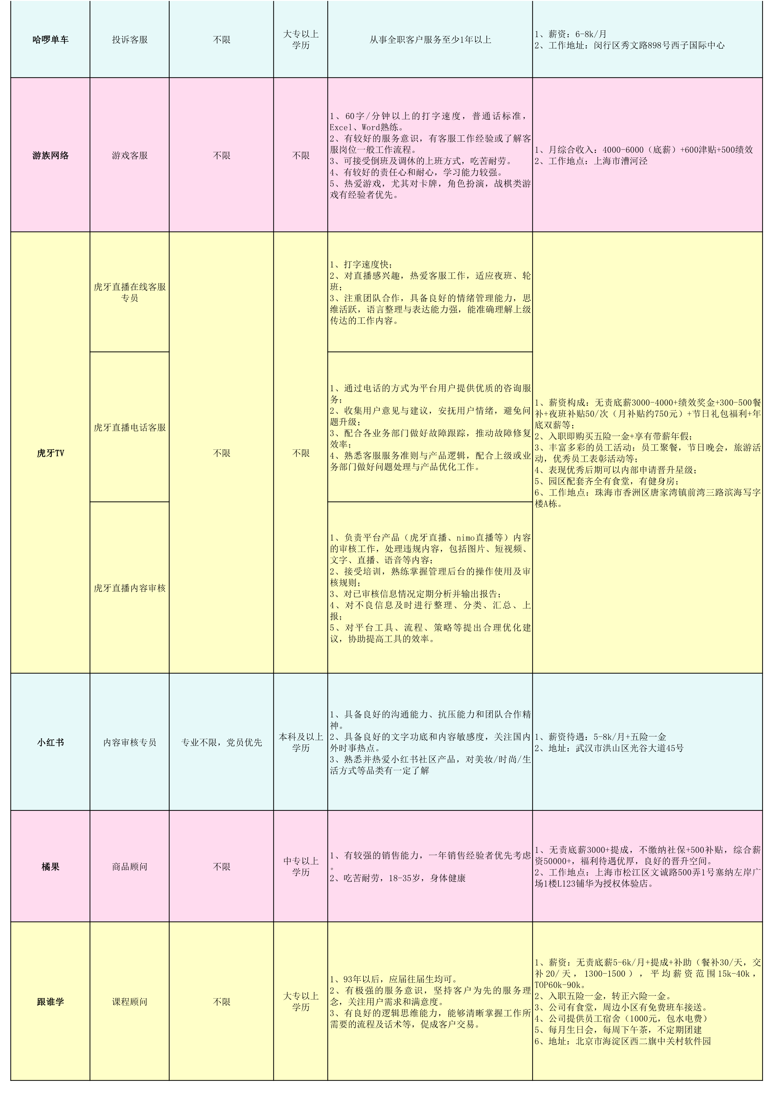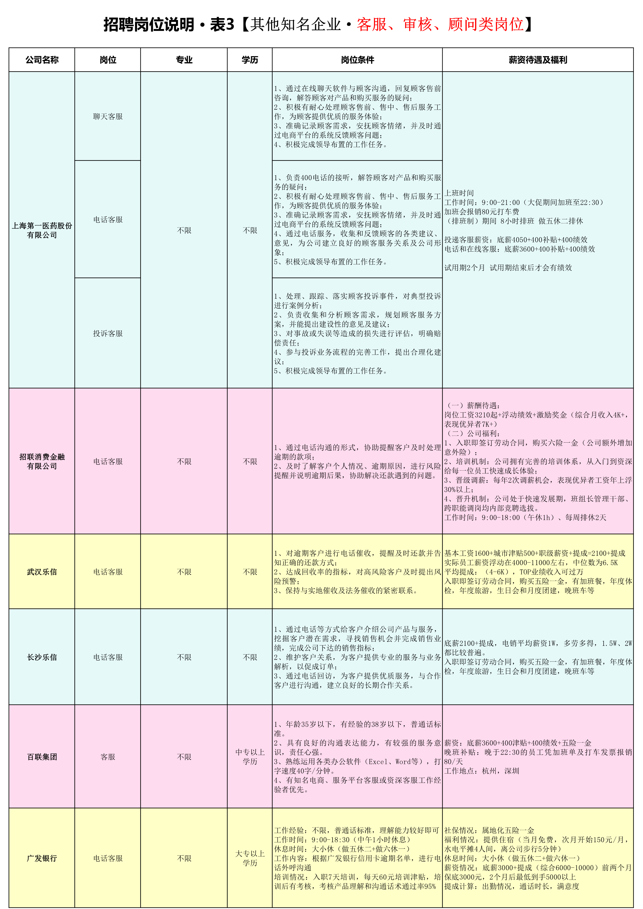 其他知名企业——客服、审核、顾问类岗位,详见附件之《招聘岗位说明 表3》