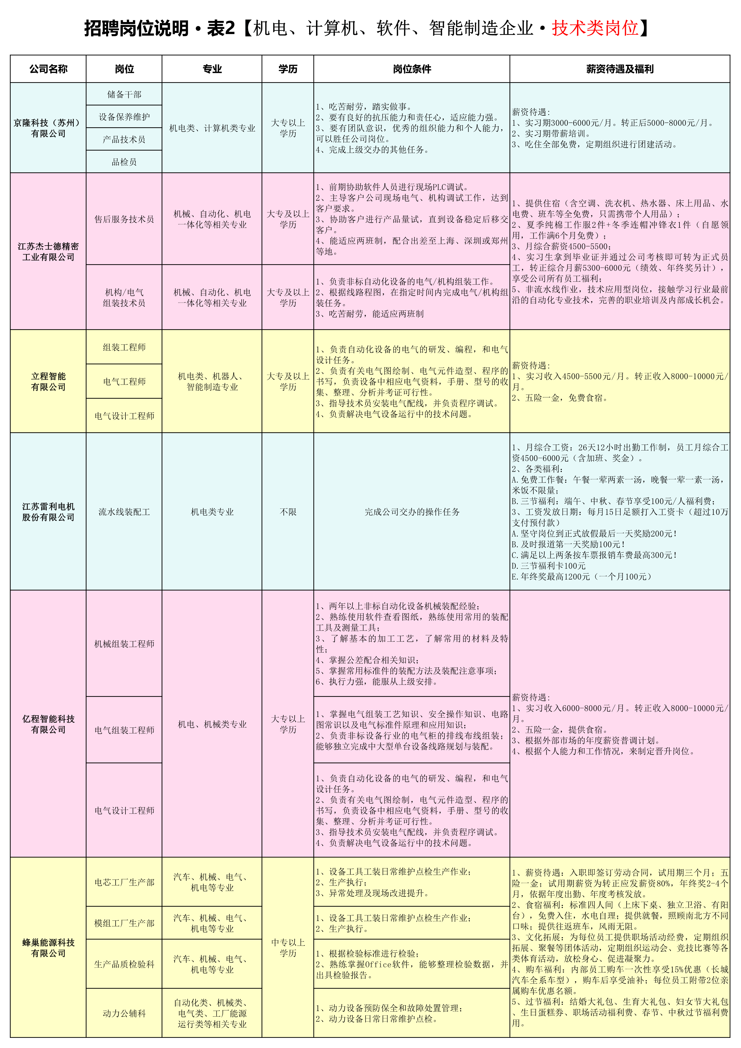 机电、计算机、软件、智能制造企业——技术类岗位,详见附件之《招聘岗位说明 表2》