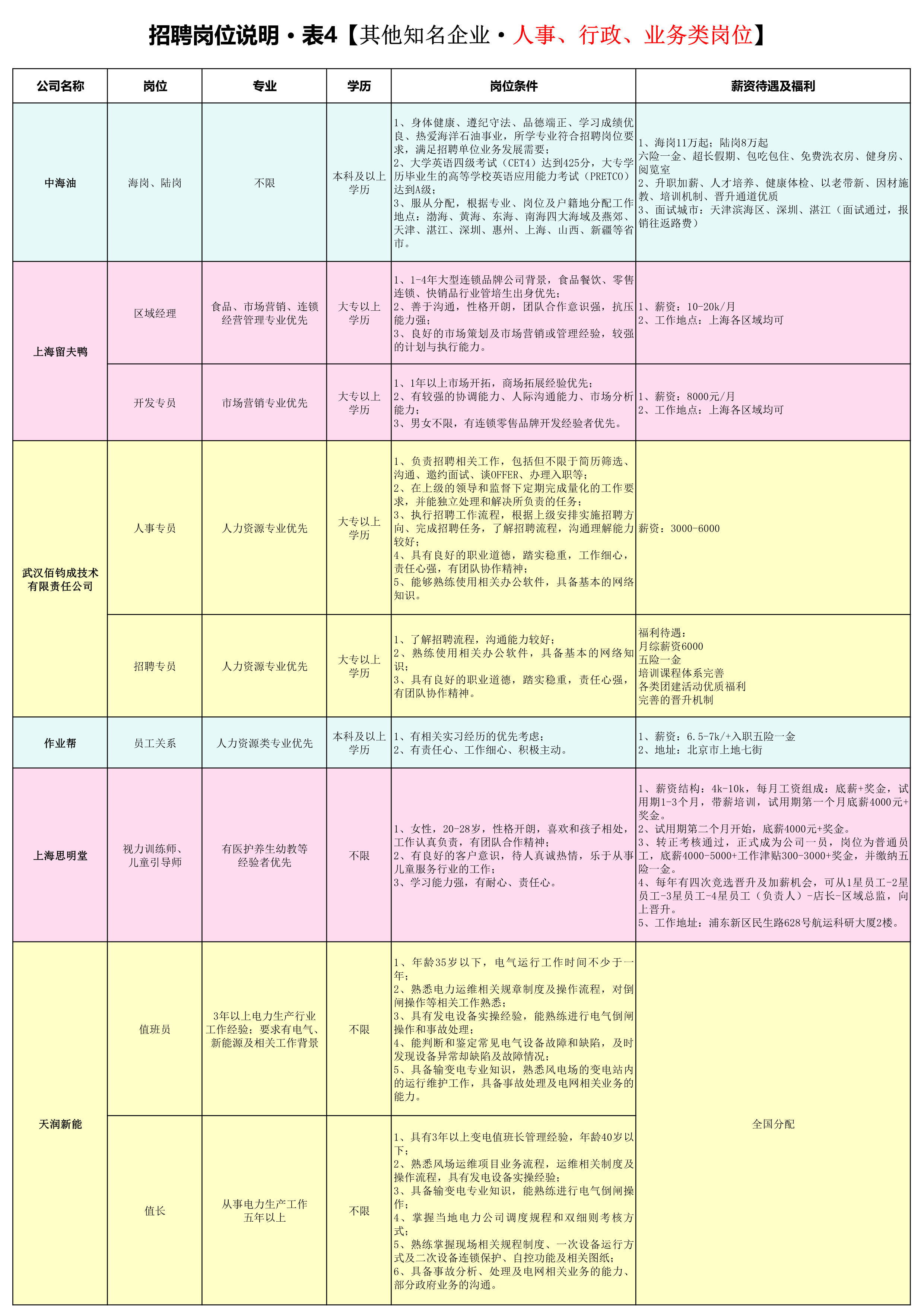 其他知名企业——人事、行政、业务类岗位,详见附件之《招聘岗位说明 表4》