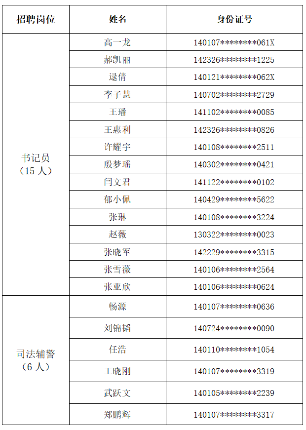根据太原市杏花岭区人民法院公开招聘劳务派遣制书记员、司法辅警的相关要求,经过线上报名、资格审查、理论考试、技能测试等招聘环节,现确定21名入围面试人员,名单如下(按姓氏拼音排序):