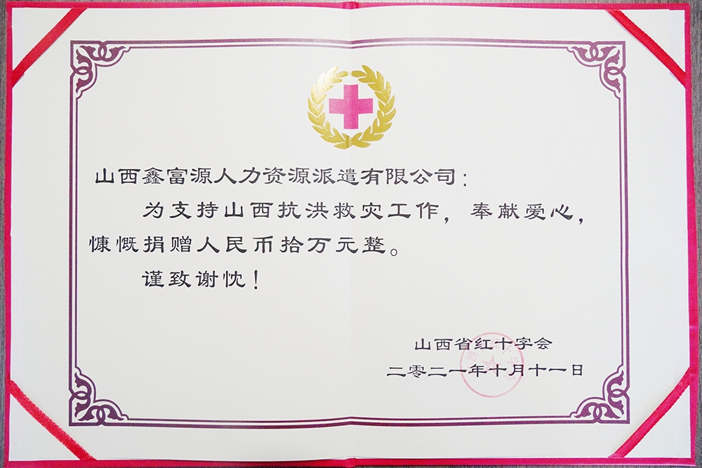 10月11日,山西威廉希尓指数500人力资源派遣有限公司向山西省红十字会捐款10万元,积极支援灾区群众抗洪救灾,共渡难关,重建家园。山西省红十字会专职副会长白冰,山西威廉希尓指数500人力资源派遣有限公司董事长韩红光,总经理李小芳,区域总监刘莉等领导出席了捐赠仪式。